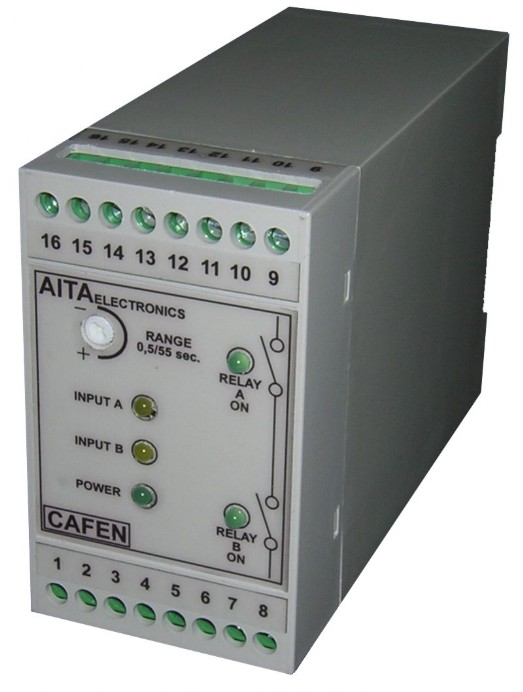 Il "CAFEN" è in grado di indicare se un determinato apparato si trova "IN MOTO" o è "FERMO". Se ai suoi due ingressi vengono applicati degli impulsi, provenienti da due sensori a 2 fili di tipo "NAMUR", il "CAFEN" terrà diseccitati i suoi relè interni. Al mancare degli impulsi in ingresso e trascorso il tempo inpostato (regolabile tra 0,5 a 55 sec.), i rispettivi relè verranno eccitati e di conseguenza chiusi i due contatti in uscita che stanno ad indicare: apparato sotto controllo "FERMO". Al comparire del primo impulso i relè verranno diseccitati e di conseguenza aperti i due contatti in uscita che stanno ad indicare: apparato sotto controllo "IN MOTO".